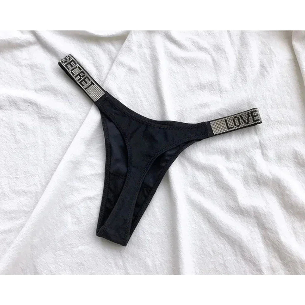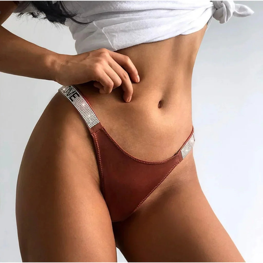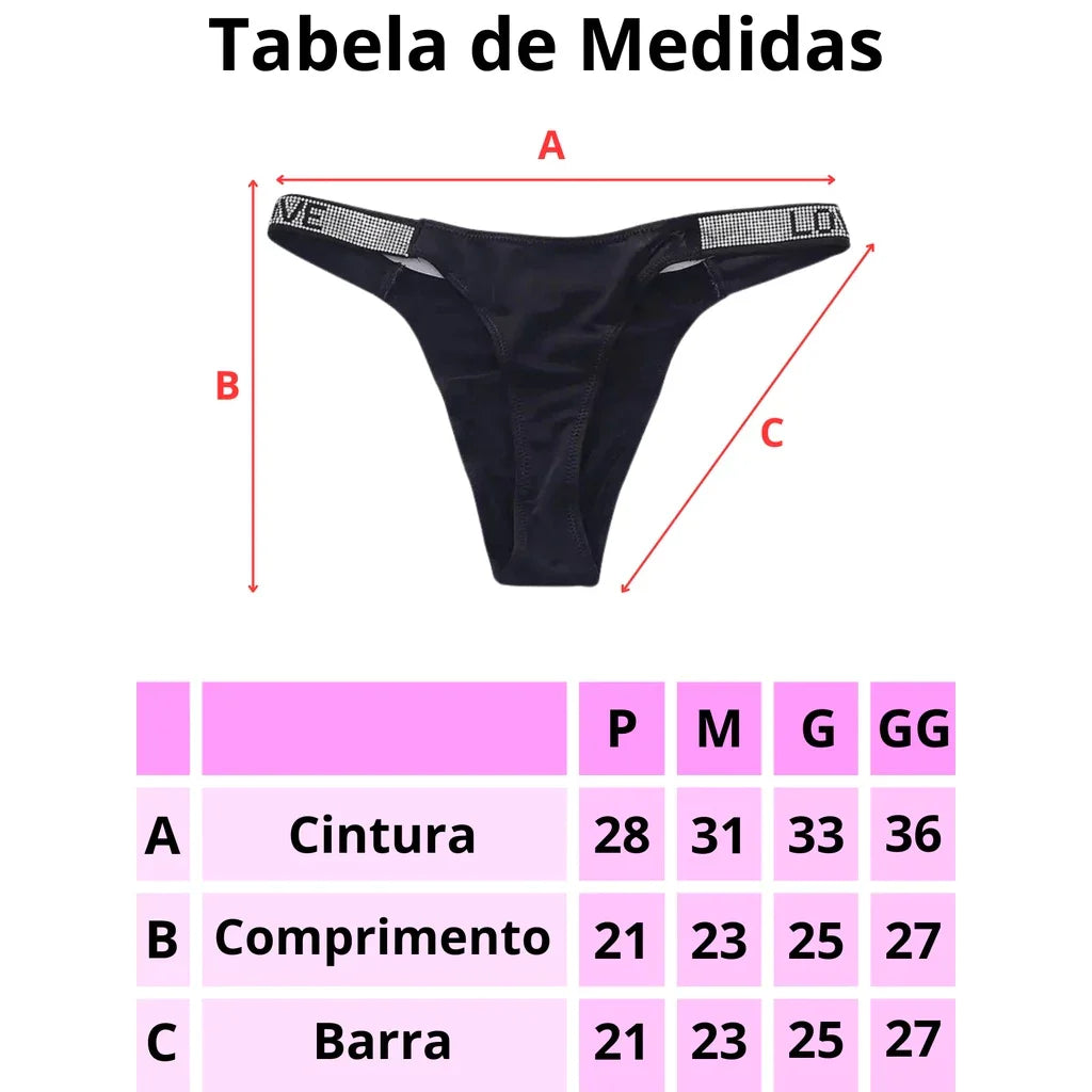 A calcinha fio dental com strass é uma peça íntima feminina sensual e elegante.